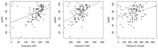 Comparison between eGFR in mL/min/1.73 m2 and PET information about volume of renal cortex in mL with linear regression. R2 for IC 50% was 0.176; p < 0.001. R2 for IC 30% was 0.231; p < 0.001, and R2 for IC 20 abs. was 0.104; p < 0.001, respectively.