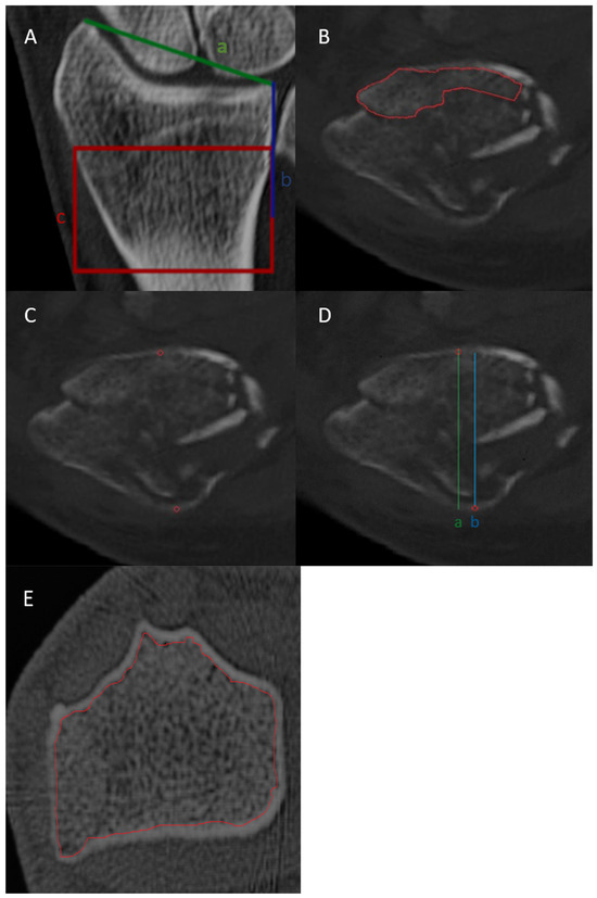 Definition of the metaphyseal area of interest. (A) To normalize the location for opportunistic BMD assessment, a line connecting the styloid process and the distal radioulnar joint was drawn (a). A second line (b) measuring half the length of line (a) was then drawn proximally along the medial border of the radius (b). The end of line (b) was used to construct a rectangle (c) with the height of (b). (B) Within the rectangle, the trabecular bone was delineated throughout the entire stack of 2D slices to obtain a three-dimensional region of interest (ROI) for DECT-based BMD assessment and trabecular HU measurement. In this example, the intact segment covers less than 25% of the rectangle’s volume. If all intact segments in the entire stack of 2D slices covered less than 25% of the rectangle’s volume, the patient was excluded from the analysis. (C) Cortical HU values were obtained by manual measurement of the anterior and posterior corticalis (circles in red) and by calculation of the mean value. (D) The cortical thickness ratio was obtained by dividing the outside diameter (a) of the radius by the inside diameter (b). The circles outlined for measuring cortical HU values were used as reference points for the anterior and posterior cortical bone (E) The non-fractured segment in the rectangle covers the whole volume within the rectangle in this 2D slice, and the patient was included in the study.