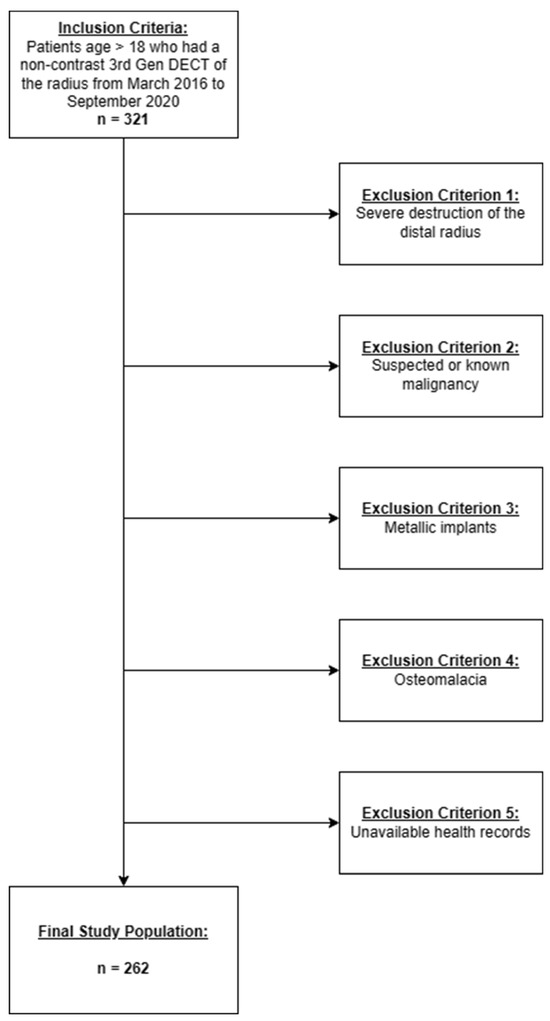 CT scans of adult patients who underwent DECT scans of the distal radius between March 2016 and September 2020 were retrospectively obtained at the University Hospital Frankfurt through the internal picture archiving and communication (PACS) system. The exclusion criteria were severe destruction of the distal radius, suspected or confirmed malignancies, metallic implants, osteomalacia, and unavailability of medical records.