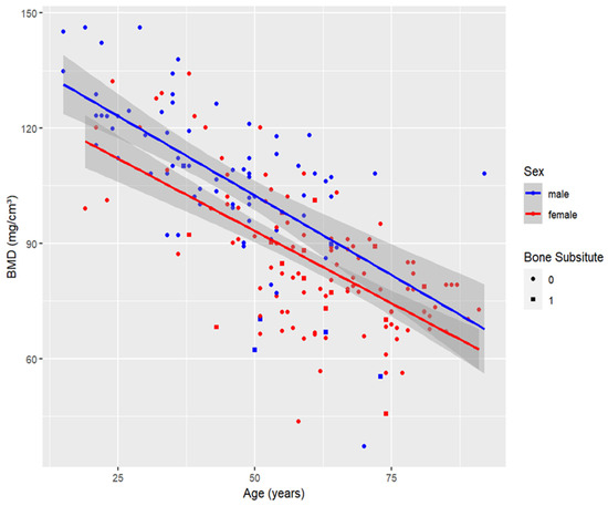 Scatter plot showing volumetric bone mineral density (BMD) values with and without bone substitutes, by age in years, of the total study population (n = 262). The dark gray area marks the 95% confidence interval.