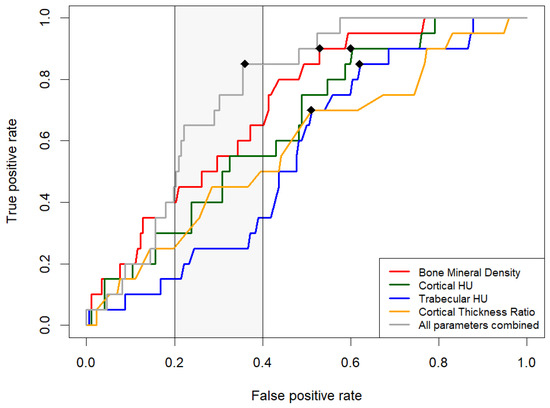 A pairwise analysis of ROC curves revealed that the AUC of BMD was significantly greater than the AUC of trabecular HU (p < 0.05), but not for the other metrics. A false positive rate of less than 0.2 leads to a true positive rate of less than 0.5 for all the metrics in our study. The partial AUC (FPR AUC 0.2–0.4) of DECT-based BMD was significantly higher than the AUC of trabecular HU and cortical thickness but not significantly different from the AUC of cortical HU. The AUC of our combined model of all metrics was significantly greater than the AUC for trabecular HU and cortical thickness. The partial AUC of the combined model (FPR AUC 0.2–0.4) was significantly higher than all other metrics (Table 4, Figure 5).