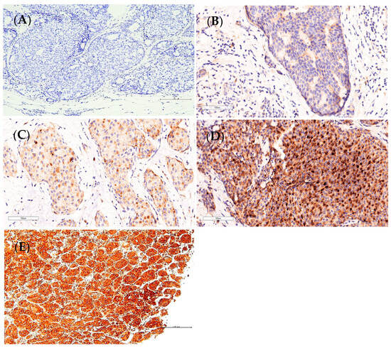 GDF11 expression was assessed using both IHC and histochemical scoring (H-score) methods, as described in previous studies [,]. Both cytoplasmic and membranous expressions were included and considered positive. The intensity of immunostaining was graded as follows: ‘0’ none, ‘1+’ weakly detectable, ‘2+’ moderate, and ‘3+’ strong (Figure 1). In brief, the H-score was calculated as the sum of the products of the GDF11-positive cell percentage in different staining intensity categories and their respective intensity scores, using the following formula: H-score = [1 × (% of GDF11-positive cells with intensity score 1)] + [2 × (% of GDF11-positive cells with intensity score 2)] + [3 × (% of GDF11-positive cells with intensity score 3)]. The GDF11-positive cell percentage for each intensity category used in the above formula was calculated as the average of 10 randomly chosen high-power fields at 400× magnification. The final H-score ranged from 0 to 300.