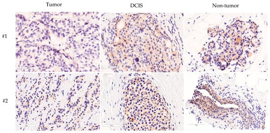 The immunohistochemistry analysis revealed the expression of growth differentiation factor 11 (GDF11) in the cytoplasm and focal membrane of all examined tissues, including breast cancer, ductal carcinoma in situ (DCIS), and non-tumor tissues. Interestingly, the GDF11 expression was higher in the DCIS and normal tissue specimens compared to the tumorous specimens (#1 and #2).