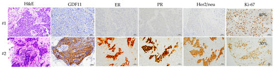 Illustrative immunohistochemistry images are provided to depict the localization of H&E, GDF11, ER, PR, Her2/neu, and Ki67 in two cancer tissues (#1 and #2). H&E, hematoxylin and eosin stain; GDF11, growth differentiation factor 11; ER, estrogen receptor; PR, progesterone receptor.