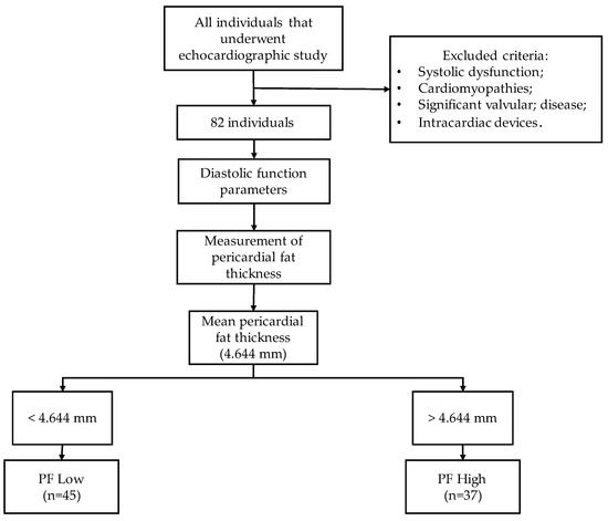 The E/e’ ratio, septal e’, and lateral e’ are echocardiographic parameters that indicate the speed of left ventricular (LV) relaxation, which decreases due to some compressive condition affecting normal functioning, thus reducing its speed [11,27]. It is credible to assume that deregulation in the production of anti-inflammatory and anti-atherogenic cells, deficiency in the mediating enzyme of the renin–angiotensin–aldosterone system, and the migration of fibrosis-inducing cells are the mechanisms behind the development of atherosclerosis and consequent myocardial dysfunction. This suggests that the fat surrounding the heart could potentially trigger cardiovascular diseases. The compression of EF and PF on the myocardium has a significant impact on ventricular relaxation, leading to cardiac remodeling [28].