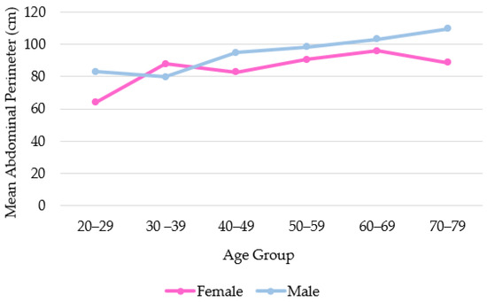 An analysis was carried out to understand the relationship between waist circumference and age by sex. Figure 2 shows the distribution of average abdominal circumference by age group and sex. Men have a greater average waist circumference than women, increasing with age (p < 0.0001). There is a slight difference in the age group of 30 to 39 years, where females have a larger average waist circumference, but this is not statistically significant.
