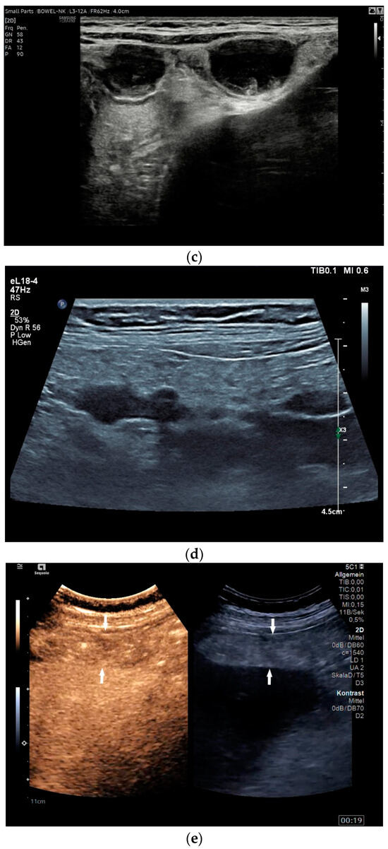 - Sidhu, P.S.; Cantisani, V.; Dietrich, C.F.; Gilja, O.H.; Saftoiu, A.; Bartels, E.; Bertolotto, M.; Calliada, F.; Clevert, D.A.; Cosgrove, D.; et al. The EFSUMB Guidelines and Recommendations for the Clinical Practice of Contrast-Enhanced Ultrasound (CEUS) in Non-Hepatic Applications: Update 2017 (Short Version). Ultraschall Med. 2018, 39, 154–180. [Google Scholar] [CrossRef]
