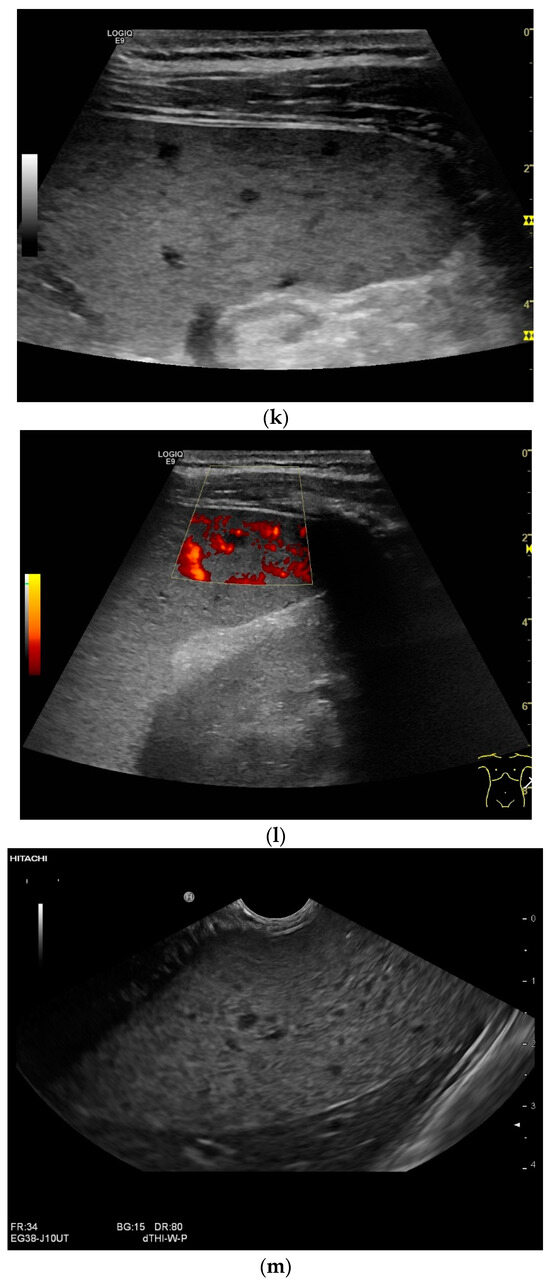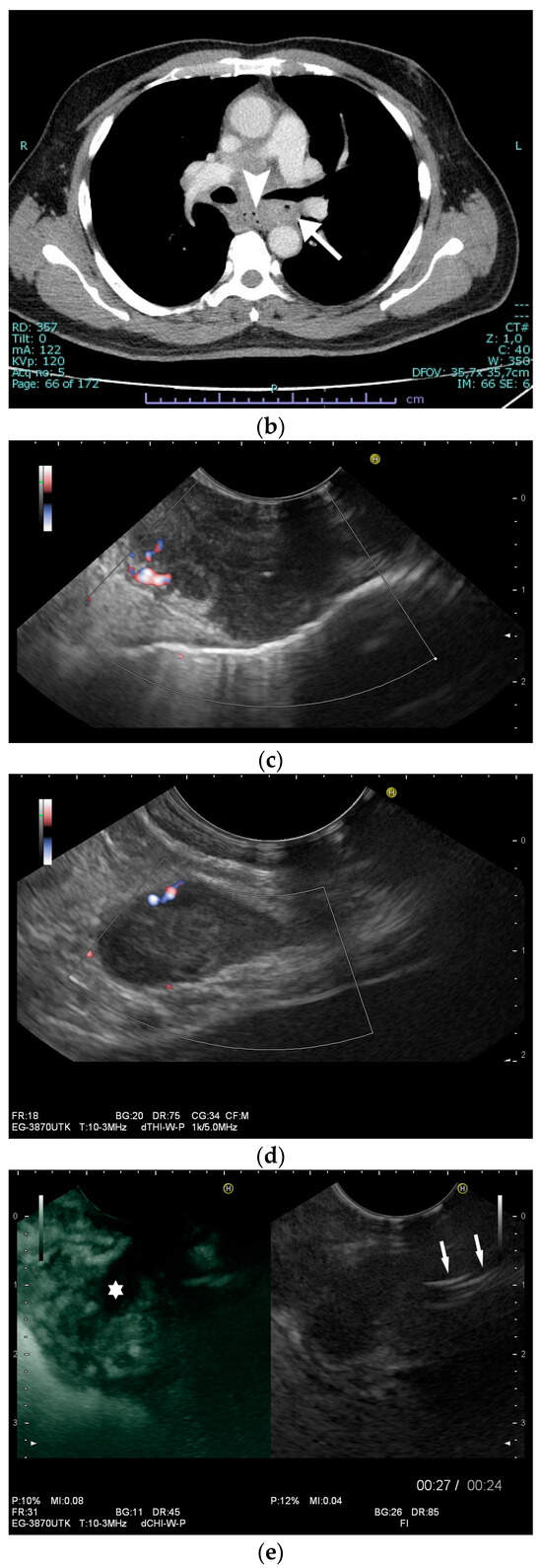 Mediastinal lymph nodes can be biopsied using EUS- or EBUS-guided FNA or FNB. Via paraoesophageal, paragastric, and paraduodenal access, histological specimens can be obtained from further lymph nodes using EUS-guided sampling [41,43,45,46,47,48,49,50] [Figure 2a–m]. The most important differential diagnoses are metastases of malignant tumors, non-Hodgkin’s and Hodgkin’s disease and other infections.