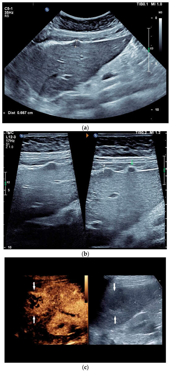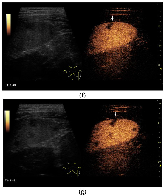 Ultrasound presents hypoechoic or isoechoic liver lesions [56]. Hyperechoic lesions are rarely described (although, these can be found in hepatitis B infections and hepatitis C-related liver cirrhosis; however, histologically confirmed cases have categorized these as tuberculoma related, and not as regenerative nodule or hepatocellular carcinoma (HCC)) [59,61]. Depending on the stage of the disease, the inflammatory lesions are homogeneously hyperenhanced via CEUS. Most lesions develop a washout in the portal venous phase. Melting abscesses show a hyperenhanced rim with either a hypoenhanced or nonenhanced center or a heterogeneous enhancement [62,63] [Figure 3c,d]. Vascular complications, such as portal vein thrombosis, have been caustically described and found to be in connection with hepatitis B [54,64].