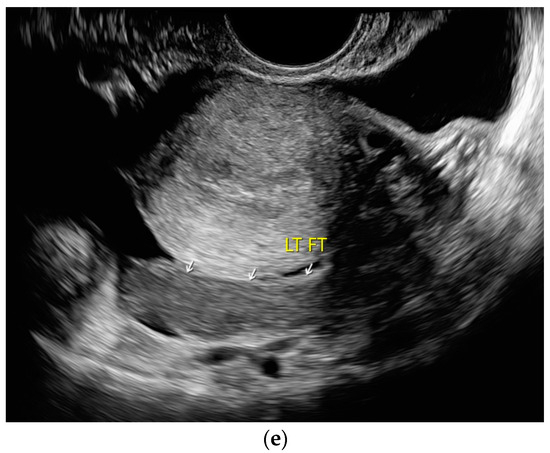 Tuberculosis of the uterus and adnexae. Female patients with tuberculosis in India. Pelvis with tubo-ovarian masses: Hypoechoic lesion in right adnexa (arrows) (a) and hypoechoic lesion in left adnexa and a small amount of free fluid (arrows) (b). Free fluid in the Douglas space (arrows) (c). Thickened right fallopian tube (RT FT) (arrows) (d); thickened left fallopian tube (LT FT) (arrows) (e).