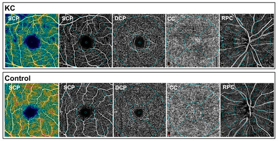 Exemplary images of the optical coherence tomography angiography (OCT-A) vessel density (VD) measurements. Exemplary participants from the KC group (top) and the control group (bottom). Displayed are from left to right: heat map of the VD of the superficial capillary plexus (SCP), vessel visualization of the SCP, vessel visualization of the deep capillary plexus (DCP), the choriocapillaris (CC) and the radial peripapillary capillaries (RPCs). The blue circles indicate the subregions. Note the reduced VD in the SCP heat map in the KC eye compared to the healthy control.