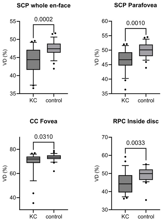 A noticeable reduction in the SCP of the macular whole en-face OCT-A and in the parafoveal region of the SCP was detected (SCP whole en face: KC 44.40 [41.58; 47.13], controls 47.40 [46.33; 48.83] µm, p = 0.0002; SCP parafovea: 46.70 [44.70; 49.28], controls 50.10 [47.95; 51.93] µm, p = 0.0010). There was a trend to the reduction in the foveal region of the SCP (SCP fovea: 17.35 [14.00; 26.15], controls 21.75 [20.25; 25.30] µm, p = 0.0719). There were also noticeably reduced VD in the foveal CC VD and the inside disc VD of the RPC OCT-A (CC fovea: KC 71.97 [68.72; 74.02], controls 73.55 [72.01; 75.03], p = 0.0310, inside disc RPC: KC 44.30 [39.55; 49.10], controls 49.90 [46.45; 52.28], p = 0.0033). No noticeable differences were found for the other parameters.