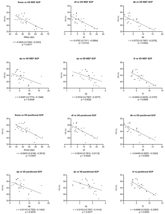 Moderate negative correlations (r ≥ 0.4) were detected for the Kmax and the whole en-face macular SCP VD (r = −0.5836 [−0.7964; −0.2423]), as well as for the df, db, dp and dy values and the whole en-face macular SCP VD (df: r = −0.4702 [−0.7311, −0.0894], db: r = −0.5733 [−0.7907; −0.2276], dp: r = −0.5497 [−0.7774; −0.1946] and dy: r = −0.5734 [−0.7907; −0.2277]). A strong negative correlation (r ≥ 0.6) was found for the D score and the whole en-face macular SCP VD (r = −0.6304 [−0.8220; −0.3107]). Strong negative correlations were also calculated for the Kmax, db value and D score and the foveal SCP VD (Kmax: r = −0.6240 [−0.8185; −0.3012], db: r = −0.6448 [−0−8297; −0.3324] and D: r = −0.6496 [−0.8322; −0.3397]) and moderate correlations for the df, dp and dy values and the foveal SCP VD (df: r = −0.5616 [−0.7814; −0.2112], dp: r = −0.5110 [−0.7552; −0.1424] and dy: r = −0.5103 [−0.7547; −0.1414]). Only weak correlations (r < 0.4) were detected for the control group, except for moderate negative correlations between the db values and the whole en-face macular SCP VD (r = −0.4064 [−0.6921; −0.0105]) and db values and the parafoveal subregion of the SCP VD (r = −0.4435 [−0.7150; −0.0558], p = 0.0232).