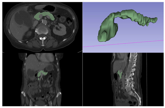 Automatic segmentation of the pancreas was performed using the open-source software TotalSegmentator (version 1.5.6 [24]) in Python (version 3.7). Figure 1 shows an example of automatic segmentation of the pancreas.