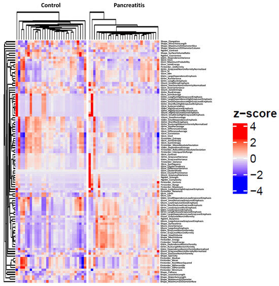 Unsupervised hierarchical clustering was performed for all extracted and normalized radiomics features in patients with and without acute pancreatitis. Data are visualized in a heatmap (Figure 2).