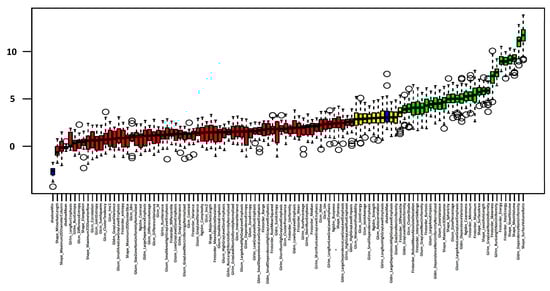 Feature selection using the random forest-based Boruta package. Confirmed features are shown in green, tentative features in yellow, rejected features in red and “shadow” features in blue. Circles show outliers and the whiskers indicate minimum and maximum.