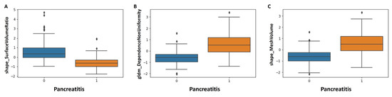 Twenty-eight features were confirmed to be important features, as shown in Figure 3. Detailed data about feature importance are presented in Supplemental Table S1. Especially, shape features (7/28) and first-order features (7/28) were selected as important features; shape features describe the shape of a given mask (segmentation)/region of interest and therefore the boundaries of the pancreas. First-order features describe the distribution of intensities (Hounsfield units in this study) for each voxel. Also, glszm features (5/28) and gldm features (5/28) were confirmed to be important features for discrimination between AP and controls. Both feature types analyze gray levels; glszm features focus on gray-level zones and gldm features on gray-level dependencies. As the three most important features for discrimination between AP and controls, “shape_SurfaceVolumeRatio”, “gldm_DependenceNonUniformity” and “shape_MeshVolume” were selected (Figure 4). Using non-parametric tests, significant differences between patients with and without AP were found in these three features (p-value < 0.001) and in most other selected radiomics features. Median values of all features as well as p-values are presented in Table 2.