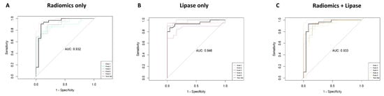 All features that were confirmed as important features after RF-based selection were included in the model as independent variables and analyzed in the binary logistic regression model for AP as the dependent variable. ROC analysis of the test set revealed an excellent performance of the model, including radiomics features only for the diagnosis of AP with an average AUC of 0.932 (95%-CI: 0.852–1.00) (Figure 5). Including lipase levels only, we observed an AUC of 0.946 (95%-CI: 0.883–1.00) for the correct diagnosis. Including a combination of both—lipase levels and radiomics features—showed an excellent AUC of 0.933 (95%-CI: 0.850–1.00) for the detection of AP.