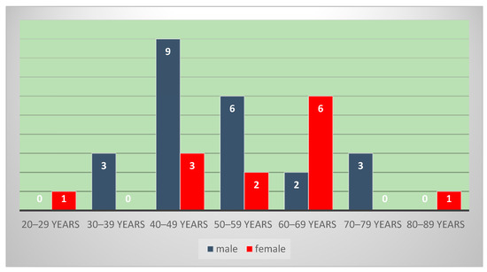 The 36 patients were between 23 and 81 years of age, with an average age of 54 years, and the peak incidence was in the 4th and 5th decade for males (25% respectively 16.6%), and in the 6th decade for female (16.6%). We noticed a predominance of the male sex (63.8%), with a male/female ratio of 1.7 (Figure 1).