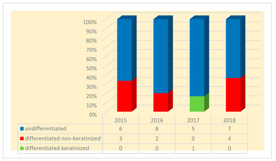 The histopathological diagnosis was completed using immunohistochemical markers for epithelial/squamous differentiation, for peri- and intratumor immune cellular infiltrates, and for pathogenic and prognostic markers.