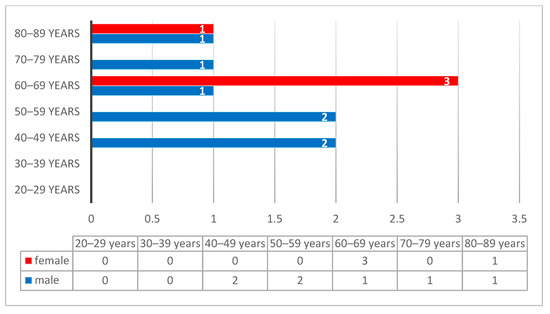 The cases diagnosed with undifferentiated nasopharyngeal carcinoma had a male predominance, with a peak incidence in the 4th decade (17%), following by the 5th decade (11%), while the 3rd, 6th, and 7th decades had a rate of 8% each (Figure 7). Unlike undifferentiated carcinoma, the differentiated subtype of non-keratinized squamous cell carcinoma showed an increased incidence in females, with a peak in the 6th decade (Figure 8).