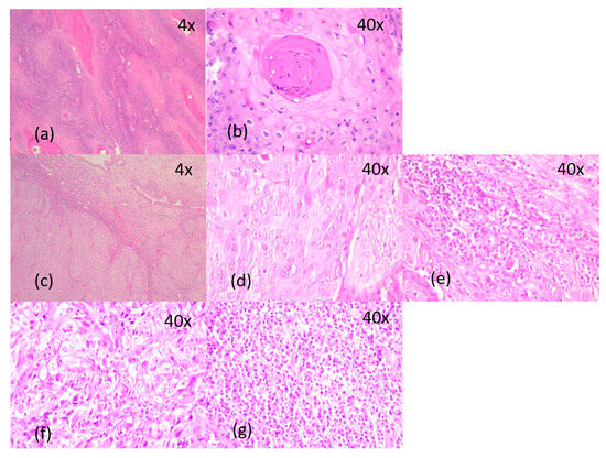 Morphological aspects of the nasopharyngeal carcinoma, hematoxylin–eosin staining: (a,b) differentiated keratinized squamous cell carcinomas; (c–e) differentiated non-keratinized squamous cell carcinoma; (f,g) undifferentiated nasopharyngeal carcinoma.