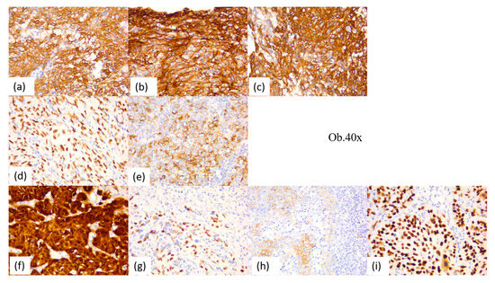 Immunohistochemical aspects of the squamous component of undifferentiated nasopharyngeal carcinoma: (a) CK AE1/AE3; (b) 34βE12; (c) CK5; (d) p63; (e) EMA; (f) p16; (g) EBV; (h) CD117; (i) p53.