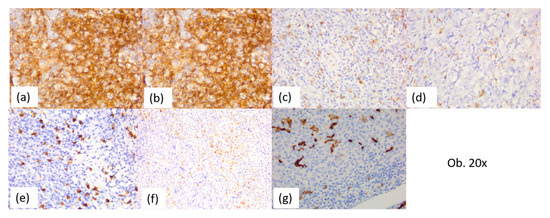 Immunohistochemical aspects of the tumor immune microenvironment of undifferentiated nasopharyngeal carcinoma: (a) LCA; (b) CD20; (c) CD4; (d) CD8; (e) CD117; (f) CD68; (g) CD1a.