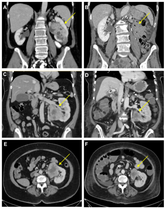 Clinical course of mRCC patients. (A,B) Computed tomography scans of the primary tumor in a 58-year-old female with oligometastatic mRCC before (A) and after (B) a left-sided tumor nephrectomy (Patient 1). (C–F) Tumor-bearing left single kidney in a 63-year-old female patient with congenital renal agenesia on the right side before (C,E) and after (D,F) the first cycle of therapy with ipilimumab/nivolumab with tumor regression (−31% after RECIST; Patient 2). Arrows indicate RCCs except in B.