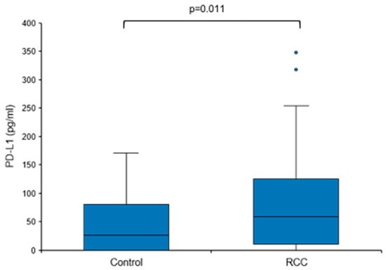 Based on these findings, we next sought to address the question of whether baseline urine PD-L1 levels were also elevated in treatment-naïve patients with RCC, i.e., prior to surgery or any other therapy. Urine PD-L1 was measured in patients with a renal mass suspicious for RCC before diagnosis and a control group consisting of urologic patients without malignant diseases. Only patients with histologically confirmed RCC remained assigned to the RCC group (n = 49); patients with no histological evidence for RCC (e.g., oncocytoma) were moved to the control group (total n = 31; Table 1 and Table 2). The overall urine PD-L1 detection rate was 80% (71% in the control group and 84% in the RCC group). Urine PD-L1 levels were significantly higher in the RCC group when compared to the control group (median 59.04 vs. 25.71 pg/mL, p = 0.011; Figure 3).