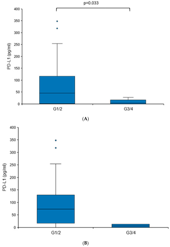 When comparing tumors with different grades (G1/G2 vs. G3/G4), a statistically significant elevation in urine PD-L1 levels was found in more differentiated tumors (73.62 vs. 6.13 pg/mL, p = 0.033), although it needs to be mentioned that G3/G4 tumors comprised only 6.1% of the RCC cohort (Figure 4A). There were no significant differences in the urine PD-L1 levels when patients were sub-stratified according to histology (clear cell versus non-clear cell RCC), T stage, nodal status or the presence of distant metastasis.