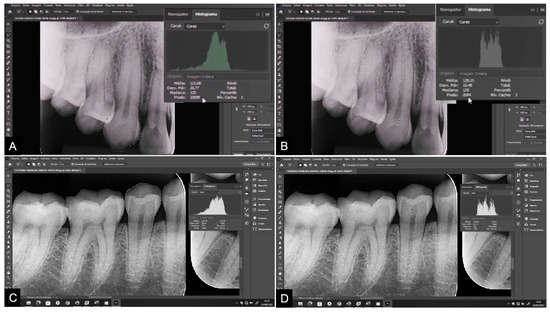 Measurements of tooth and pulp areas and pixel values on periapical radiograph: (A,B) maxillary canine; (C,D) mandibular second premolar.