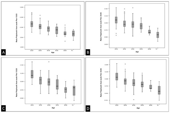 The boxplot charts of the pulp/tooth ratio of the pulp/tooth ratio of the mandibular second premolars on the panoramic radiographs (Figure 3B) illustrate medians with positive and negative asymmetrical distributions, which are particularly noticeable between the ages of 30–39 and 60–69 years. High interquartile ranges indicate similar pulp/tooth ratio values in over 50% of the cases among the 30–39, 40–49, 50–59, and between the 60–69 and 70 years or older age groups.