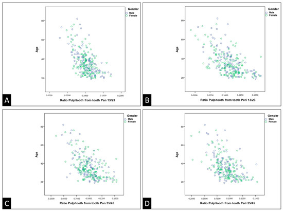The dispersion diagrams of the pulp/tooth ratio of the maxillary canines and mandibular second premolars on panoramic and periapical radiographs (Figure 4) did not demonstrate any discernable linear or non-linear relationship.