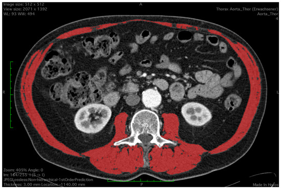 All CT images were analyzed by a trained observer, blind to the patients’ outcome. We used a semi-automated Hounsfield unit (HU)-based approach with manual correction. Skeletal muscle area (SMA) was measured at the level of the third lumbar vertebrae, which is an established landmark for measuring skeletal muscle mass in CT scans [15,16]. Both transversus processus had to be visible and two adjacent slices were analyzed. CT scans with or without contrast agent and ranging from 3–5 mm in slice thickness were analyzed using HorosTM (Version 3.3.6) and utilizing the ‘grow region’ tool. The HU threshold was set from −29 HU to +150 H for optimal muscle detection. Muscles at the level of L3 included the M. psoas, paraspinal, rectus abdominus and rectus oblique. Falsely selected areas such as visceral organs or subcutaneous tissue due to similar Hounsfield units were manually removed by the observer using the ‘brush tool’. The ‘brush tool’ allows manual editing of a region of interest (ROI). Additionally, total psoas muscle area (TPMA) was measured separately on the same two CT scan slices using the closed polygon tool. The outline of the ROI is marked with multiple manually added points which are then automatically joined into the desired shape. Right and left psoas muscle areas were measured separately (Figure 1 and Figure 2). Skeletal mass index (SMI) and total psoas mass index (TPMI) were obtained according to patient’s height (measured in meters) using the following formula: (SMA)/(patient’s height)2, and (TPMA)/(patient’s height)2. The impact of sarcopenia was assessed independently using SMI and TMPI values. Patients where first classified into two cohorts according to sex and each patient was defined as sarcopenic if their SMI or TPMI was in the lowest third of the study group. Males and females were then added to form a sarcopenic and a non-sarcopenic group for both SMI and TPMI values.