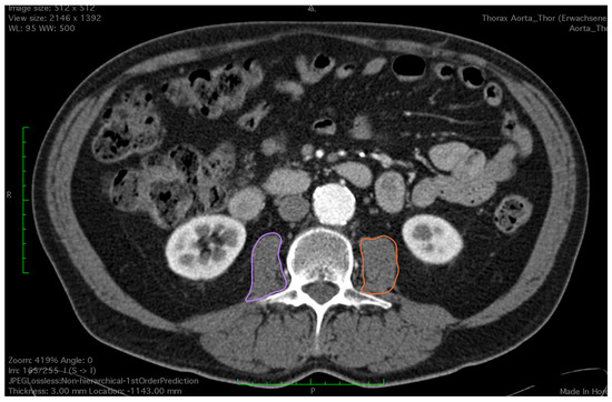 Outlining both of the psoas muscles for measurement of total psoas muscle area (purple and orange circles).