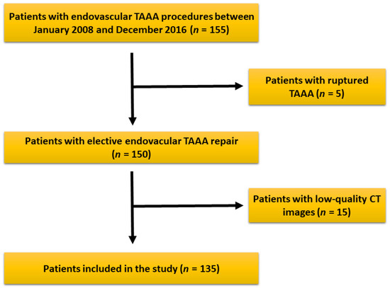 After reviewing our records, 155 patients underwent endovascular repair of TAAA in our institution during the study period. Five patients had an emergency procedure and were excluded. Fifteen more patients were excluded due to low-quality or reduced field of view (FOV) of the CT images during assessment, leaving a total of 135 patients eligible for study (Figure 3). After image evaluation, median SMI and TPMI were 44.7 ± 9 cm2/m2 and 5.3 ± 1.6 cm2/m2 for the whole cohort, respectively. The total range was 28.1–76.1 cm2/m2 for SMI and 2.08–11.3 cm2/m2 for TPMI. The interquartile range was 37.9–49.7 cm2/m2 and 4–6.1 cm2/m2 for SMI and TPMI, respectively. The cutoff values to determine sarcopenia according to SMI measurements were 43.9 cm2 for males and 35.2 cm2 for females. Regarding TPMI, the cutoff values were 5.1 cm2 and 3.6 cm2 for males and females, respectively. Patient overall demographics and cohort characteristics according to SMI and TPMI are shown in Table 1 and Table 2, respectively. There was no statistical difference between male to female ratio, age and body mass index in sarcopenic and non-sarcopenic groups regardless of the measurement method used. A statistically significant association between type II TAAA and reduced muscle mass was demonstrated after patient stratification with both SMI (p = 0.01) and TPMI (p < 0.01) measurement methods.