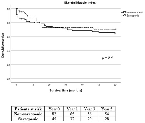 Long-term survival of sarcopenic and non-sarcopenic patients after stratification using skeletal muscle index. The Kaplan–Meier curves were compared using the log-rank test.