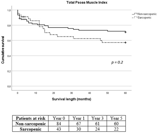 Long-term survival of sarcopenic and non-sarcopenic patients after stratification using total psoas muscle index. The Kaplan–Meier curves were compared using the log-rank test.