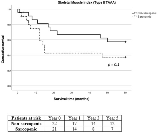 Long-term survival of sarcopenic and non-sarcopenic patients with type II thoracoabdominal aortic aneurysm after stratification using skeletal muscle index. The Kaplan–Meier curves were compared using the log-rank test.