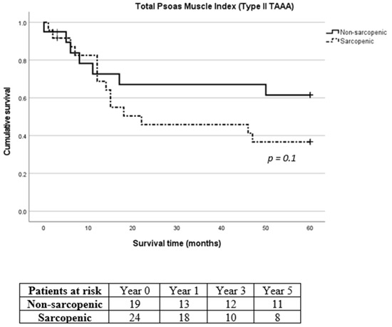 Long-term survival of sarcopenic and non-sarcopenic patients with type II thoracoabdominal aortic aneurysm after stratification using total psoas muscle index. The Kaplan–Meier curves were compared using the log-rank test.