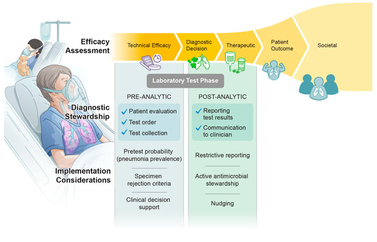 Diagnostic stewardship in infectious diseases, defined as modifying the ordering, testing, or reporting of results to improve patient care, has long been a cornerstone of medical laboratory testing and is now increasingly applied to most stages of clinical practice [54,55]. Furthermore, the relationship between diagnostic and AMS continues to be described, with both disciplines essential for optimal impact on the other [56]. Diagnostic decision-making and associated clinical behavior (e.g., antibiotic prescribing) are deeply rooted in behavioral determinants [57]. The decision to order a test is associated with the clinician’s baseline understanding of the pre-test probability of the disease of interest, and increasingly, with severe diseases such as VAP, the fear of missing something important [58,59,60,61].