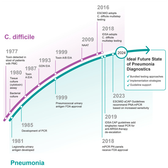 In summary, the application of mPCR testing in clinical practice and guideline recommendations is rapidly evolving for the management of pneumonia. This pivotal paradigm shift has been driven by improved diagnostic performance (i.e., sensitivity) and decreased turnaround time of mPCR testing as compared to culture. This advancement in testing capability comes with the challenge of potentially over-diagnosing pneumonia, an issue that has occurred with other disease states using molecular testing. The lessons learned from the evolution of C. difficle testing offer invaluable insights for molecular testing in pneumonia, including the correlation of highly sensitive test results with clinical disease and the implementation of multi-step testing algorithms to enhance clinical utility. Future guidelines could benefit from incorporating these insights, potentially advocating for more refined criteria for test use, or integrating multi-step algorithms with biomarkers to balance the increased sensitivity of molecular tests against the risk of overdiagnosis. What lies ahead for pneumonia advanced diagnostic technologies hinges on the adoption of pre-analytical implementation strategies (i.e., diagnostic stewardship) as history has dictated its requirement to ensure the clinical utility of testing is optimized.