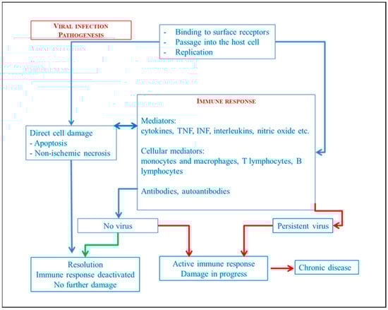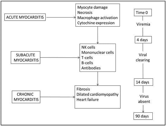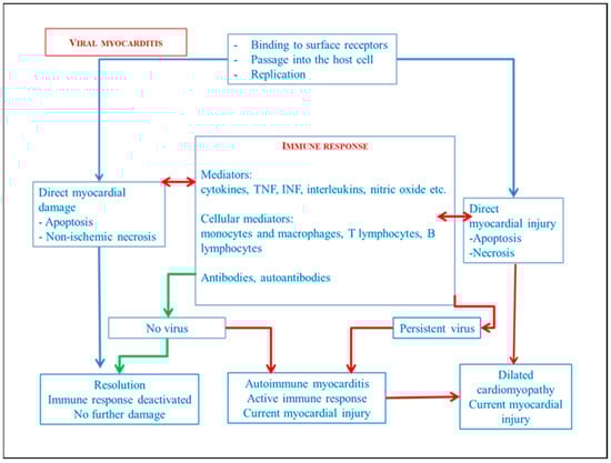 Viruses are obligate intracellular microorganisms. They enter cells by binding to surface receptors that vary from species-to-species and from cell-to-cell, and replicate using the host’s nucleic acid and protein synthesis system. Viruses can damage and kill the cell directly by inducing apoptosis or activating host cytocidal responses. In humans, the innate response is mediated by interferon, natural killer cells (NK), and macrophages. The virus directly stimulates the production of interferon by the infected cells, whose function is to inhibit viral replication in nearby cells. Natural killer cells (NK) are able to lyse cells infected by the virus recognizing a diversity of self on the cell surface. Macrophages eliminate virions from the intercellular spaces and from the vascular system. The specific antiviral adaptive response involves the combination of mechanisms mediated by monocytes, macrophages, T lymphocytes, B lymphocytes, and humoral antibody mechanisms [6,7,8,9]. Figure 2 briefly simplifies the mechanisms while Figure 3 transposes the main mechanism during viral myocarditis.