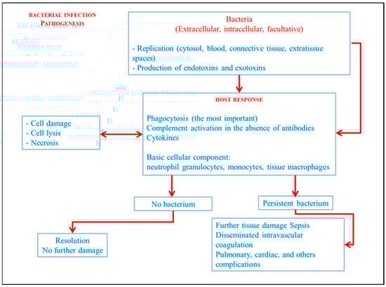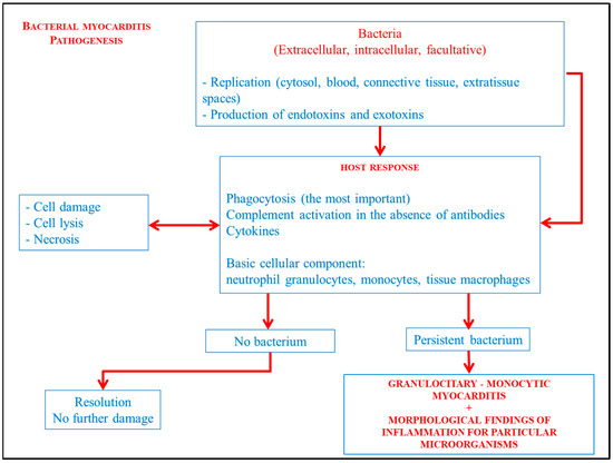 Bacteria defined as intracellular survive and replicate only in the cytoplasm and vacuoles of the host cell. Conversely, extracellular bacteria are able to replicate outside the cells in the blood, connective tissues, and extra-tissue spaces. Facultative intracellular bacteria have both capabilities. Gram-positive cocci, Gram-negative cocci, Gram-positive bacilli, Gram-negative bacilli with Enterobacteria, and Salmonella are examples of facultative bacteria. Extracellular bacteria cause disease through the induction of an inflammatory response and production of toxins with consequent destruction of the site of infection. Endotoxins and exotoxins, which are molecules and enzymes released by the bacteria and its lysis, are responsible for the destruction of tissues in the site of infection. Immune response against extracellular bacteria is aimed at eliminating the bacteria and neutralizing the effects of the toxins. Phagocytosis, cytokines and complement activation in the absence of antibodies represents the main mechanisms of natural immunity against extracellular bacteria. Therefore, the cellular component that participates most in the inflammatory response is basically represented by neutrophil granulocytes, monocytes, and tissue macrophages. For some bacteria, parasites, and fungi, the inflammation will be characterized by additional morphological findings such as granulomatous reactions or caseous reactions, which are the same in all localizations of the infection [6,7,8,9]. Figure 4 briefly simplifies the general bacterial infectious mechanisms while Figure 5 transposes the main mechanism it in the bacterial myocarditis.