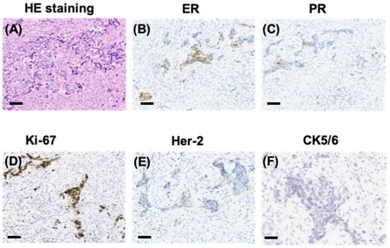 Pathological manifestations of the sternum lesions. HE staining showing sternum lesions (A) and immunohistochemical (IHC) staining showing positivity for ER (B), PR (C), and Ki-67 (D), and a Her-2/neu score of 1+ (E), and negativity for CK5/6 (F) in sternum tissue (scale bars represent 200 µm).