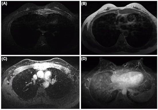 The MRI of the breast showing sternum and internal mammary node lesions without visualized lesions of both mammary glands and bilateral axillary lymph nodes. (A) SPIR (Spectral Presaturaton with Inversion Recovery) T2-weighted MR image. (B) T1-weighted MR image. (C) SPIR T1-weighted MR image. (D) Maximum density projection reconstruction.