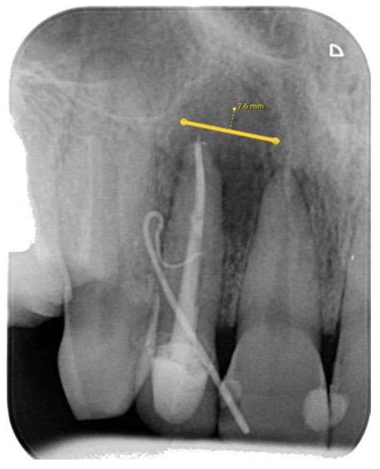 In addition, every lesion’s size was measured in millimeters (mm) at the widest periapical lesion area perpendicular to the tooth apex in the mesio–distal (MD) direction using a digital ruler (Figure 1).