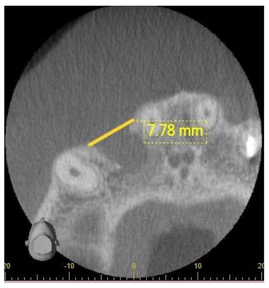 CBCT images were analyzed in the axial view assessed to precisely measure lesion dimensions in millimeters in the MD widest direction (Figure 2). Lesion detection employed a three-scale classification system for assessing periapical lesions’ absence, presence, or possible presence. This assessment aligns with the classification approaches used in PA radiography and US examinations. CBCT software Version 2, 15, 0 tools were used to navigate through different planes, including axial, coronal, and sagittal views. These views offer different perspectives on the area of interest. The axial plane view was chosen to identify the widest cortical bone disruption and lesion size measurement because it provides a horizontal cross-section of the area, which is helpful for assessing the extent of the periapical lesion and any associated cortical bone disruption. Once the widest point was identified, the measurement tool integrated into the respective software was employed. Image processing facilities provided by the i-Dixel software Version 2, 15, 0 system were used to allow the observers to improve the image quality. This helps quantify the extent of the disruption and provides valuable information for treatment planning.