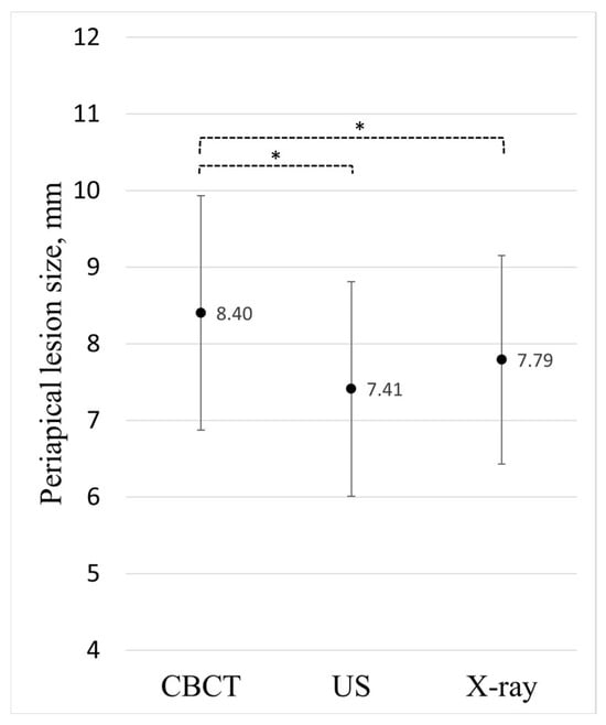Comparison of periapical lesion sizes. CBCT, US, and PA X-ray examinations for the same individuals. Means with a 95% confidence interval connected and marked with an asterisk show a statistically significant difference between the examination methods (p < 0.001, η2G = 0.008 (low effect size)).